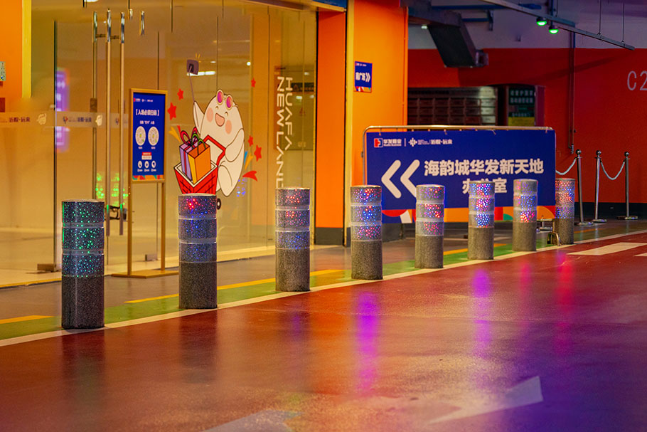 新型路障石材具有擋車功能,提升場所的形象和安全性,夜晚展現出特別絢麗的效果